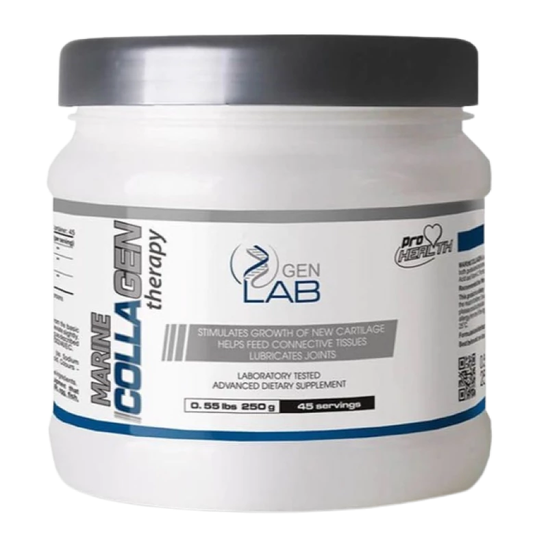 Marine Collagen від Gen Lab – високозасвоюваний риб’ячий колаген. Препарат містить гідролізовані пептиди риб’ячого колагену, що характеризуються високою біодоступністю. Цей фібрилярний білок, завдяки своїм властивостям, має високу міцність на розрив. Колаген є важливим будівельним блоком сполучної тканини, що входить до складу суглобів, хрящів, кровоносних судин та рогівки ока. Колаген також є важливим компонентом кісток, забезпечуючи їхню правильну структуру.