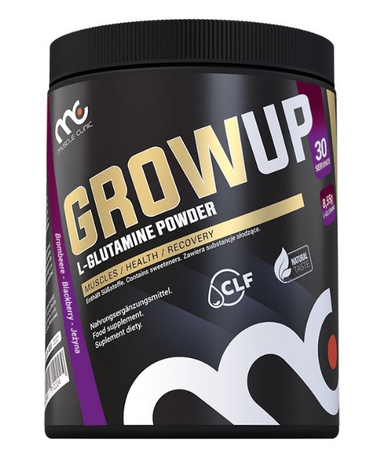 Muscle Clinic GrowUp – це порошкова добавка, що містить L-глютамін-амінокислоту, що сприяє кращому відновленню м’язів після тренування, проявляє антикатаболічну дію, а також ефективно зміцнює імунну систему.